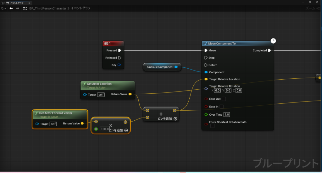 図のようにノードを組んで値を設定すると、1のキーを押下したときにキャラクターがX方向に100動きます。このとき先ほど説明したように、移動は瞬間的ではなく、OverTimeに指定している秒数に基づいて補間移動します。