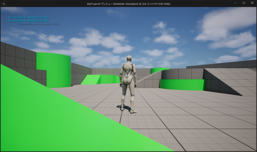 ゲームプレイで実際に確認してみよう!1のキーを押下したらしっかり設定した100分X方向に移動しましたね!