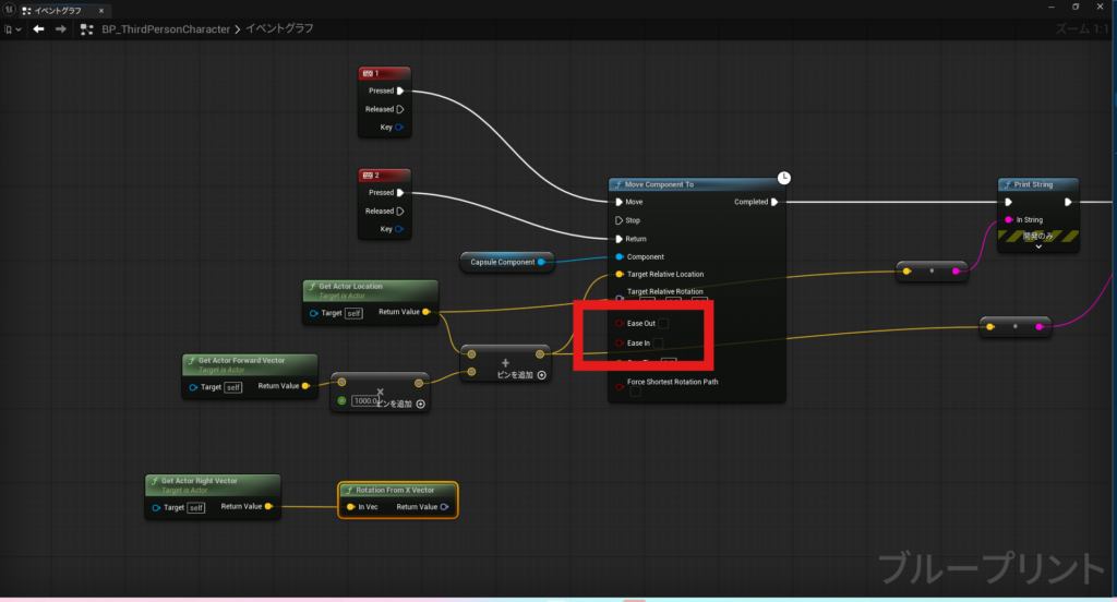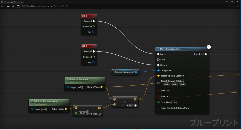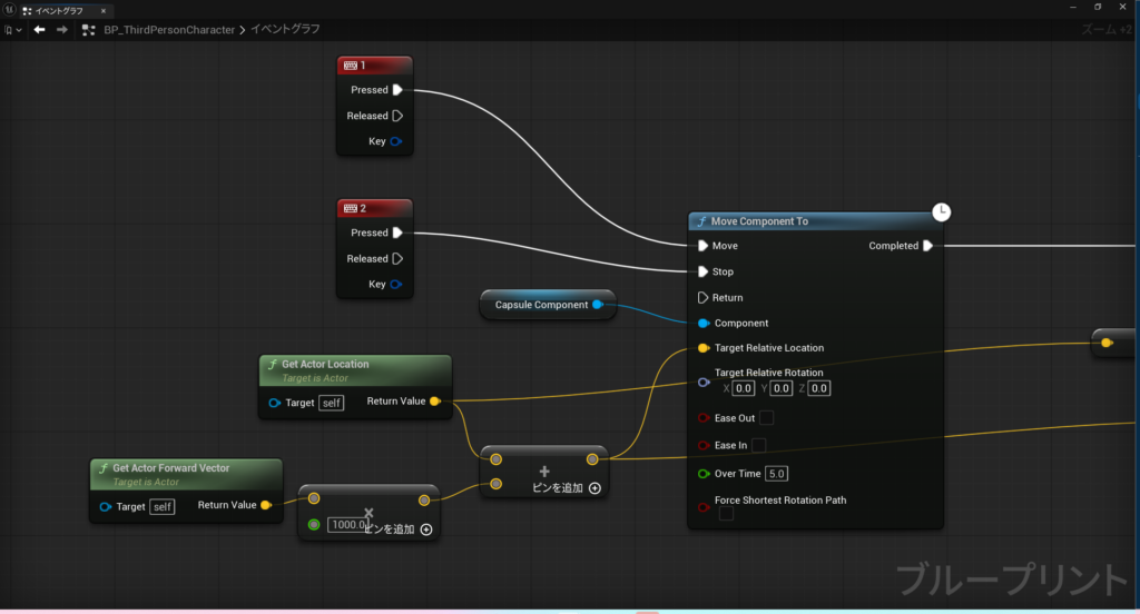 一部ノードの追加と値を変更します。図の処理では、1のキーを押したときに、5秒間かけてX方向に1000移動するのですが、移動しているとき(Move Component Toを実行しているとき)に2のキーを押下すると移動を途中で止めることができます。